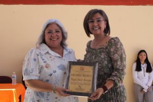 Durante el evento, la alcaldesa entregó reconocimientos al Mtro. Diego Francisco Cañez León por 25 años de servicio y a la Mtra. Magda Sotelo Montaño por 15 años de trayectoria docente.