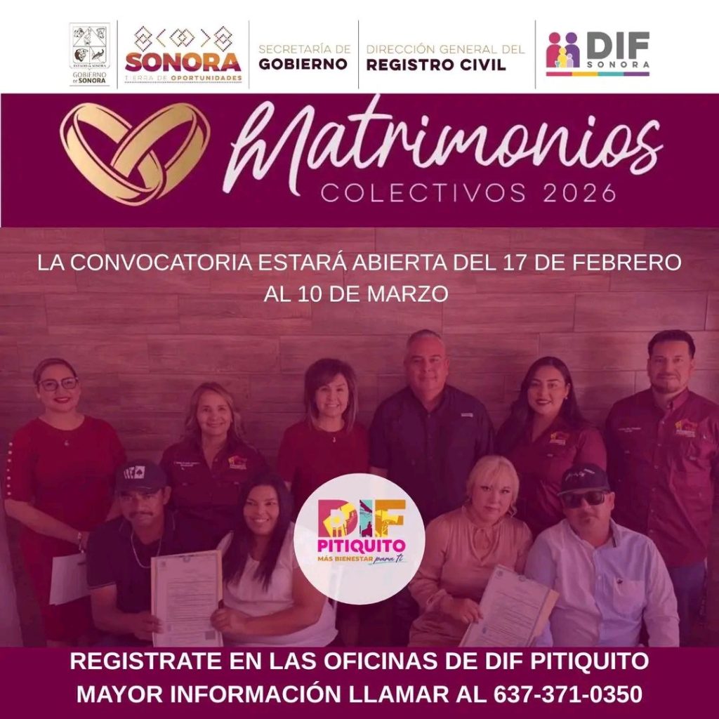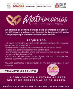 El Gobierno del Estado de Sonora a través de la Secretaría de Gobierno, DIF Sonora, DIF Pitiquito y la Dirección General del Registro Civil, invita a las parejas que desean contraer matrimonio a formar parte de los Matrimonios Colectivos 2026.