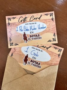 Entrega alcaldesa Janeth García mazón premio consistente en un juego de botas y cinto a Martín Azael López, ganador del número 400 dentro del sorteo realizado en el marco de las actividades de las Fiestas Patronales 2025.