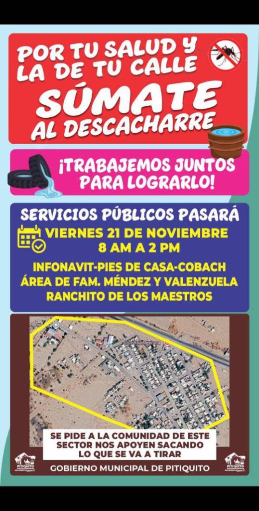 Es importante que la comunidad esté atenta y participe colocando por fuera de sus patios o casas lo que se va a retirar como llantas, cubetas, muebles viejos, fierro viejo, plásticos como galones y botes, material de construcción en desuso y todo lo que pueda contener agua que sirva como criadero del mosco y ramas. Queda claro que lo que no se estará retirando es la basura doméstica y escombro.