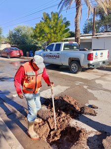 Trabajo de reparación de tubería de distribución de agua en calle principal frente al estadio de béisbol.